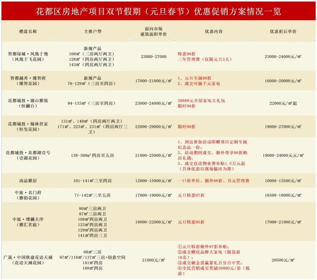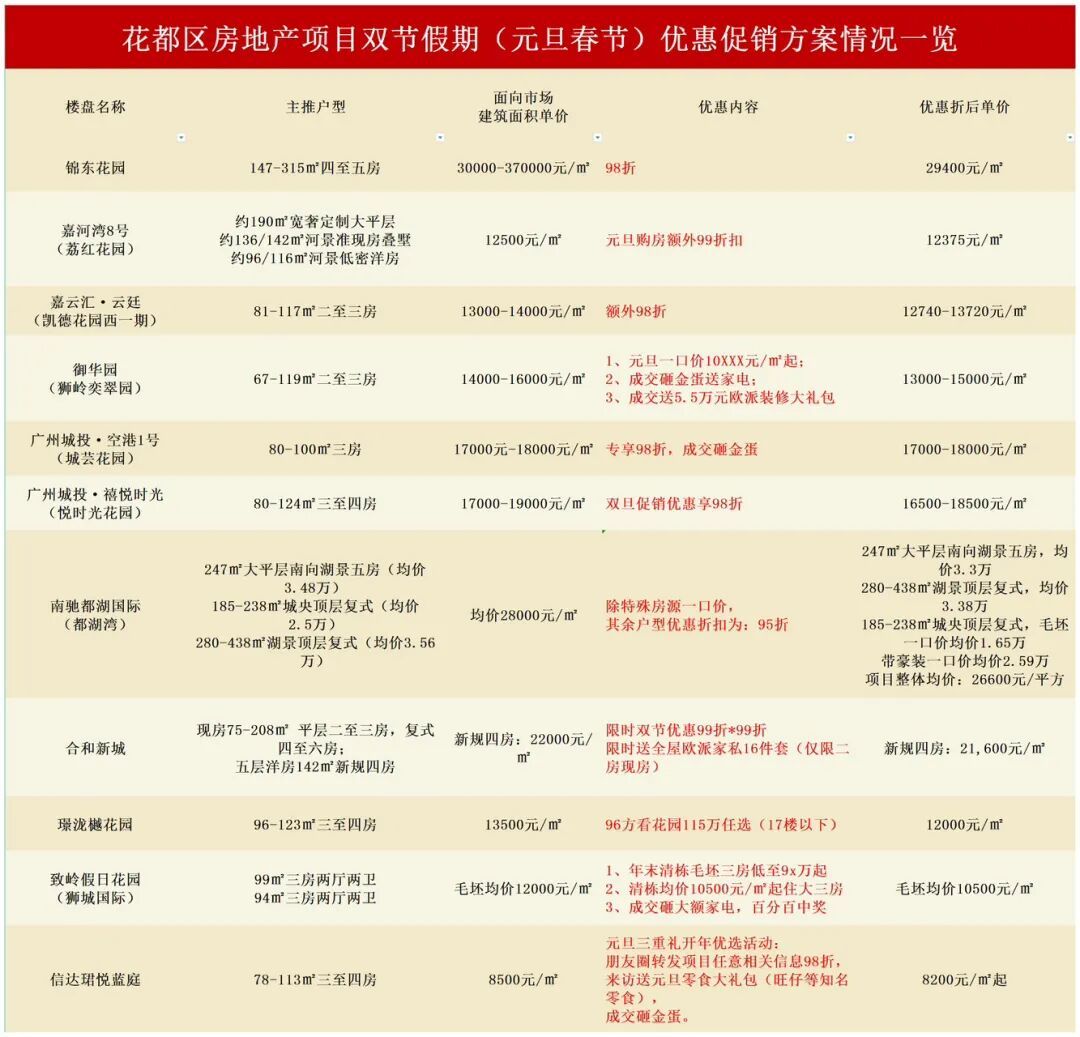 包括智都绿城·凤凰于飛(凤凰于飞花园)、智都越秀·臻智府(臻智花园)、花都城投·湖山雅筑(恒樾台)、花都城投·翰林世家(恒玺花园)、花都城投·花都湖壹号(壹湖花园)、尚品雅居、中旅·名门府(雅韵花园)、中旅·璞樾天序(雅汇茗庭)、广晟·中国铁建花语天珹(花语天珹花园)、锦东花园、嘉河湾8号(荔红花园)、嘉云汇·云廷(凯德花园西一期)、御华园(狮岭奕翠园)、广州城投·空港1号(城芸花园)、广州城投·禧悦时光(悦时光花园)、南驰都湖国际(都湖湾)、合和新城、璟泷樾花园、致岭假日花园(狮城国际)、信达珺悦蓝庭、凤凰瑞景花园(凤凰御景二期)、金地商置都会峯范(都悦花苑)、祈福万景峰、金融街花溪小镇(北优花园)、俊怡悦景台、阳光城兰园·翡澜花园、市政观璟花园、颐安·俪都府(俪都府)、天马河公馆(中房天马丽苑)、保利琅悦(琅瑞花园)、保利上宸(上宸花园)、合景保利·香樾四季花园、南华时代城(华翠园)在内的33个项目将同时开展促销活动。